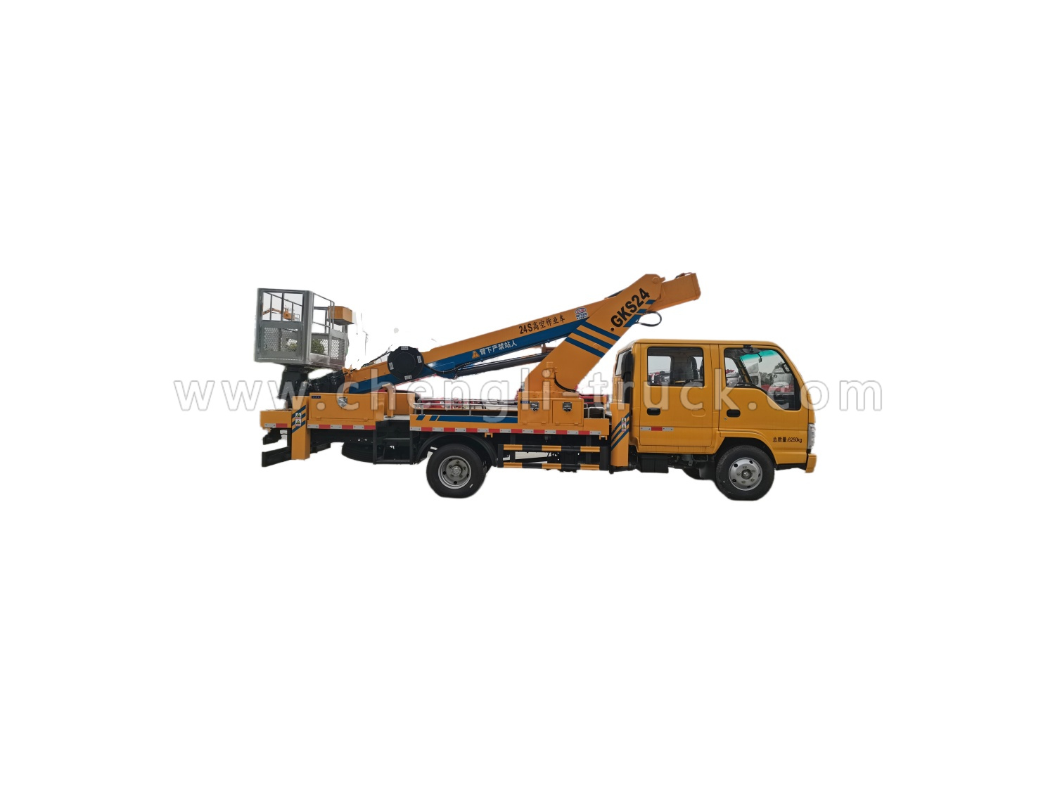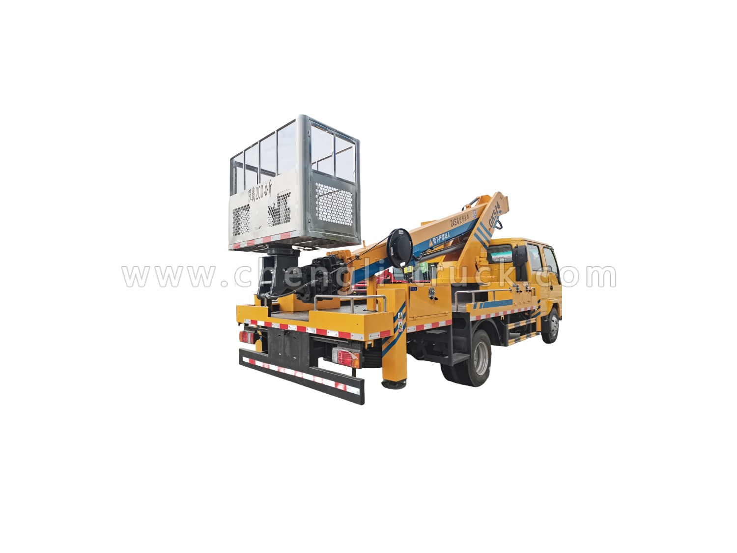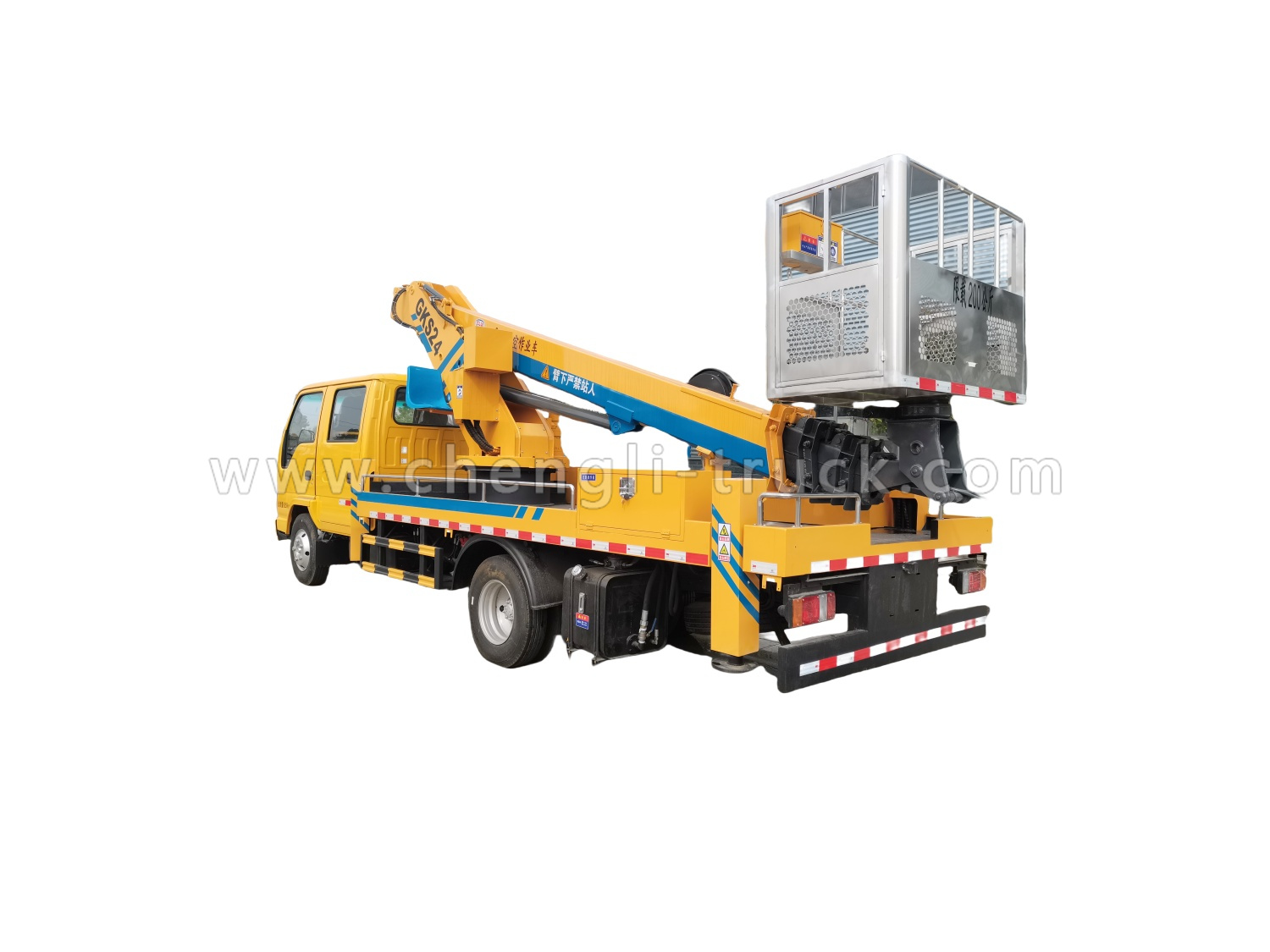 3, Aerial bucket is moving system with dual action commands, one at ground level and the other at the level of the bucket,Truck equipped with two rotating amber lights